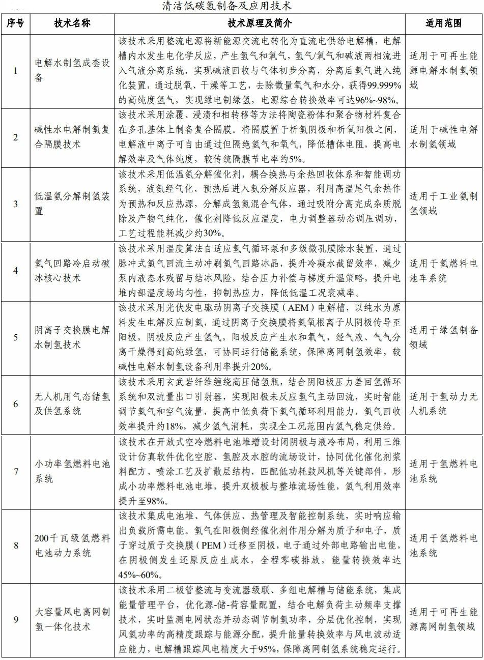 清洁低碳氢制备及应用技术有9项,分别是电解水制氢成套设备、碱性水电解制氢复合隔膜技术、低温氨分解制氢装置、氢气回路冷启动破冰核心技术、阴离子交换膜电解水制氢技术、无人机用气态储氢及供氢系统、小功率氢燃料电池系统、200千瓦级氢燃料电池动力系统、大容量风电离网制氢一体化技术。